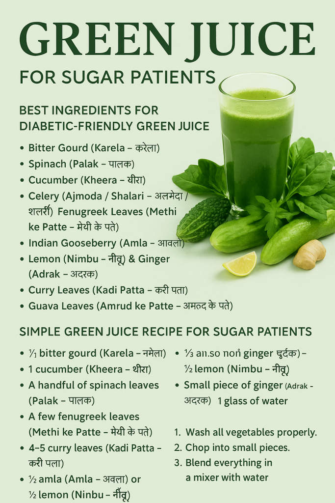 Green juice is more than just a drink—it’s a natural therapy that supports diabetic health. By combining vegetables and herbs like bitter gourd (करेला), methi (मेथी), amla (आंवला), curry leaves (करी पत्ता), and guava leaves (अमरूद के पत्ते), you are giving your body a daily dose of healing nutrition.